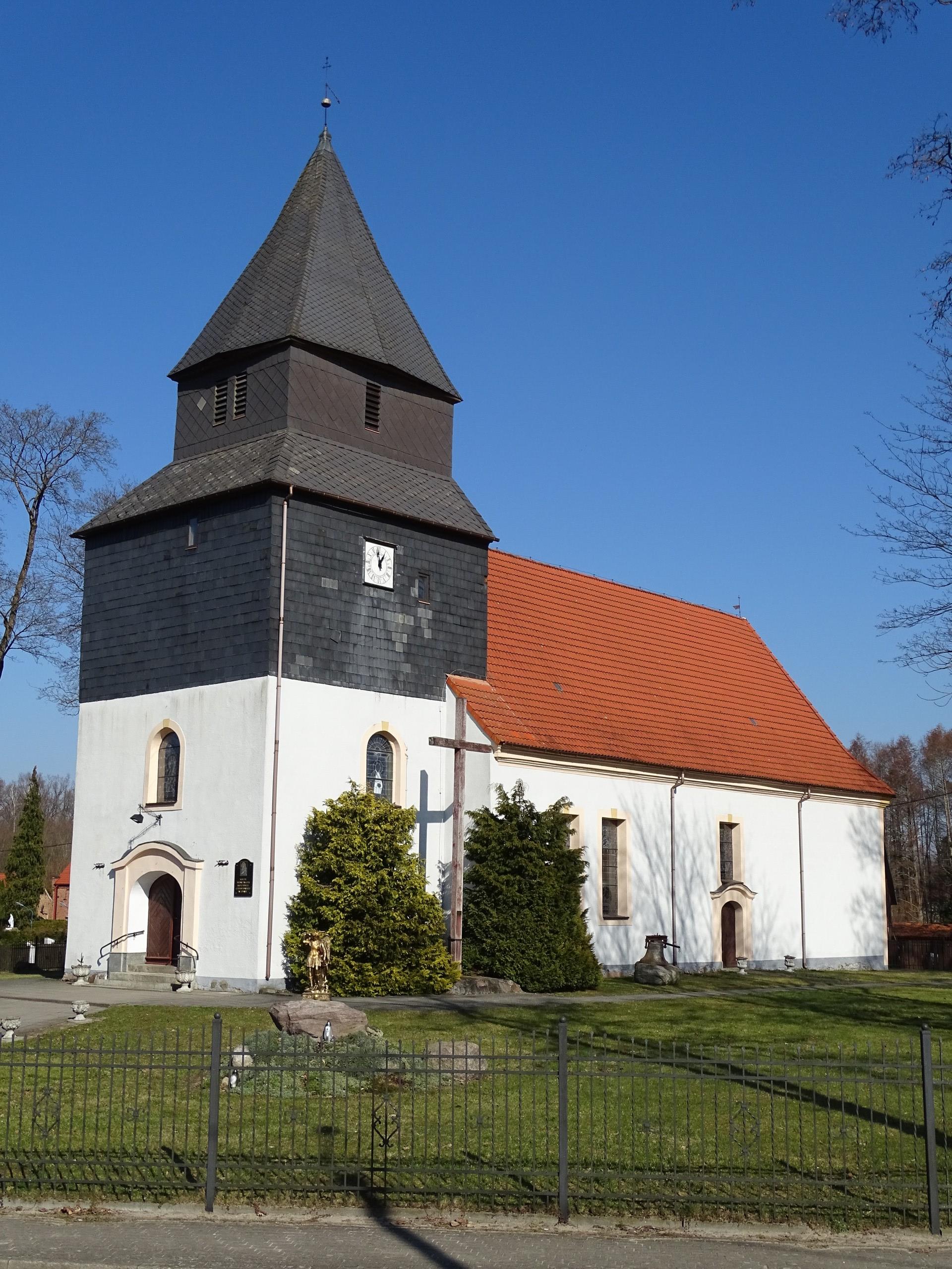 Pierwsza wzmianka na temat świątyni pochodzi z XIII wieku. Kolejne informują o pożarze kościoła w czasie wojny 30-letniej. Obecna bryła obiektu, wzniesiona w stylu rokokowym, datowana jest na lata 1767 - 1772. Niegdyś świątynię zdobiła inskrypcja z danymi fundatorów kościoła: generała Filipa Wilhelma von Grumbkowa i tajnego radcy Michała Ernsta von Boehna, a także mistrza murarskiego, który pracował przy budowie obiektu – Jana Gottfrieda.