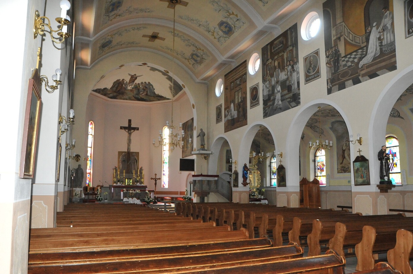 We wnętrzu na szczególną uwagę zasługują dwa barokowe ołtarze, słynąca z licznych łask figura Matki Bożej, a także – zawieszone na szczycie kościelnej wieży – trzy cenne dzwony (najstarszy z 1883 roku), wykonane z brązu. W ołtarzu Matki Boskiej znajdują się zaś liczne vota dziękczynne ofiarowane przez wiernych.