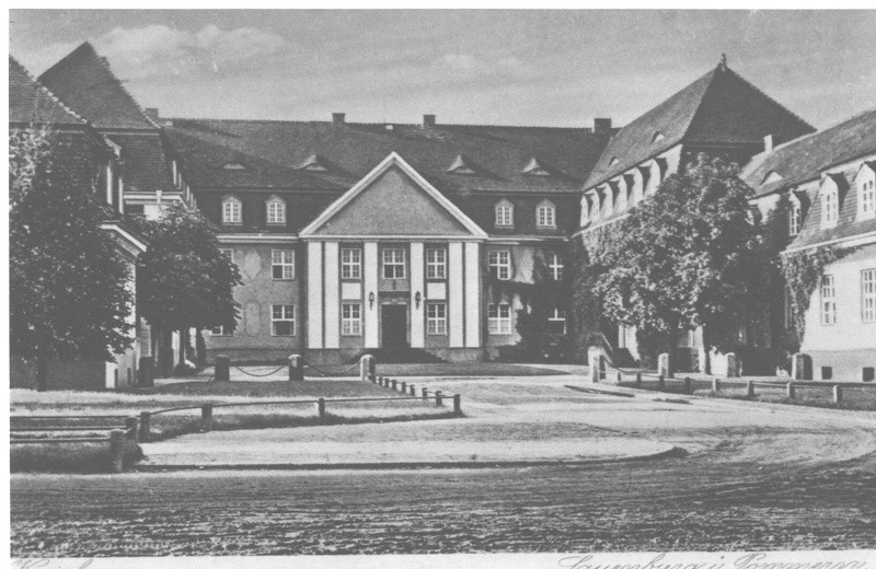 Poza granicami centrum Lęborka, z dala od ciasnej, historycznej śródmiejskiej zabudowy, jak gdyby nieco na uboczu, wybudowano – w znacznej mierze dzięki dużemu zaangażowaniu ówczesnego starosty, dra Wilhelma Kutschera – w latach 1914-15, okazały, przestronny gmach, mający w założeniach od początku pełnić funkcję siedziby władz powiatowych. Obiekt wzniesiono w stylu neoklasycystycznym według projektu niemieckiego architekta, Paula Schultze-Naumburga.