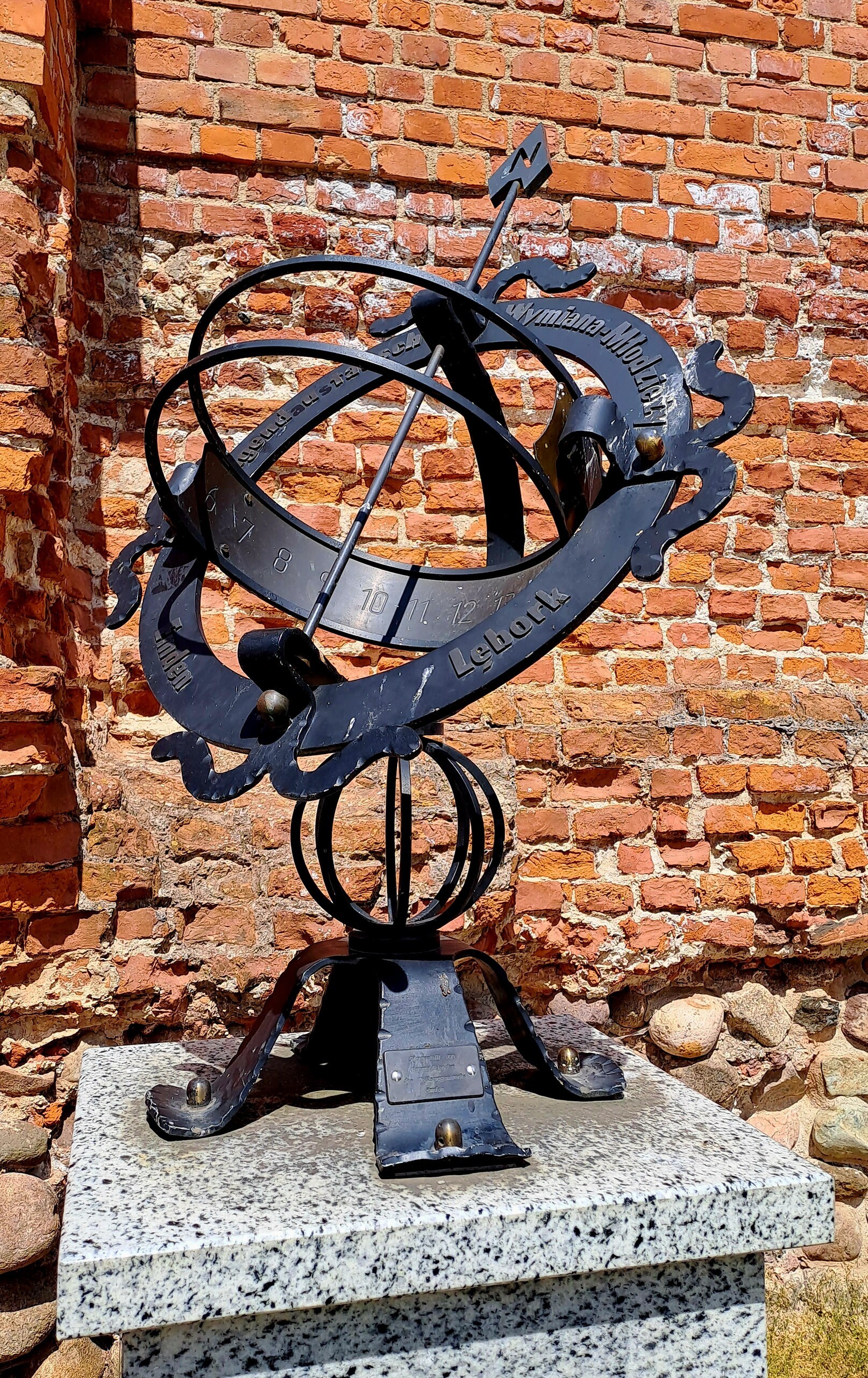 Na początku lat dziewięćdziesiątych XX wieku chronometr, w podziękowaniu za wieloletnią współpracę w ramach wymiany polsko-niemieckiej młodzieży szkolnej, otrzymało lęborskie I Liceum Ogólnokształcące. Staraniem nauczyciela geografii, pana Wiesława Budkowskiego, zegar następnie przekazano Miastu, by, dzięki społecznej pracy lokalnych firm oraz osób prywatnych, umieścić go na kamiennym postumencie w eksponowanej lokalizacji – odpowiednio nasłonecznionej i atrakcyjnej turystycznie zarazem – zgodnie z głównymi kierunkami geograficznymi.