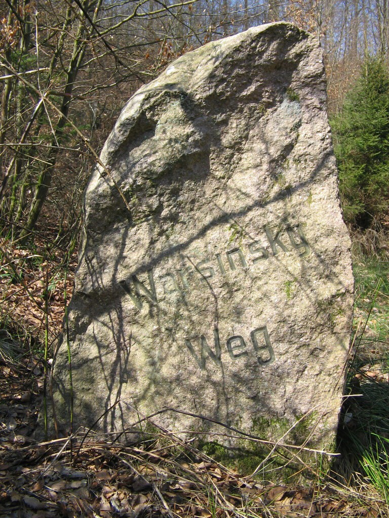 W sąsiedztwie szosy łączącej Cewice z Osowem Lęborskim, w starej przesiece leśnej, u stóp stromego wzniesienia, w niezwykle urokliwym miejscu, gdzie rozpoczyna swój bieg niewielki strumień, spoczywa zagadkowy kamień. Powierzchnię głazu zdobi, zachowany w nienagannym stanie, stary napis: "Warsinskÿ Weg" ("Szlak Warsińskiego"). Nazwisko "Warsinsky" ("Worsinsky"), analizując zapisy książki adresowej z 1929 roku, nosił leśniczy z pobliskiej niemieckiej wsi Wussow (dzisiejsze Osowo Lęborskie). I to być może właśnie jego upamiętnia ów tajemniczy kamień.