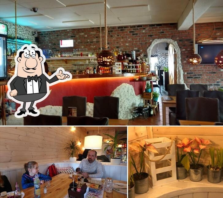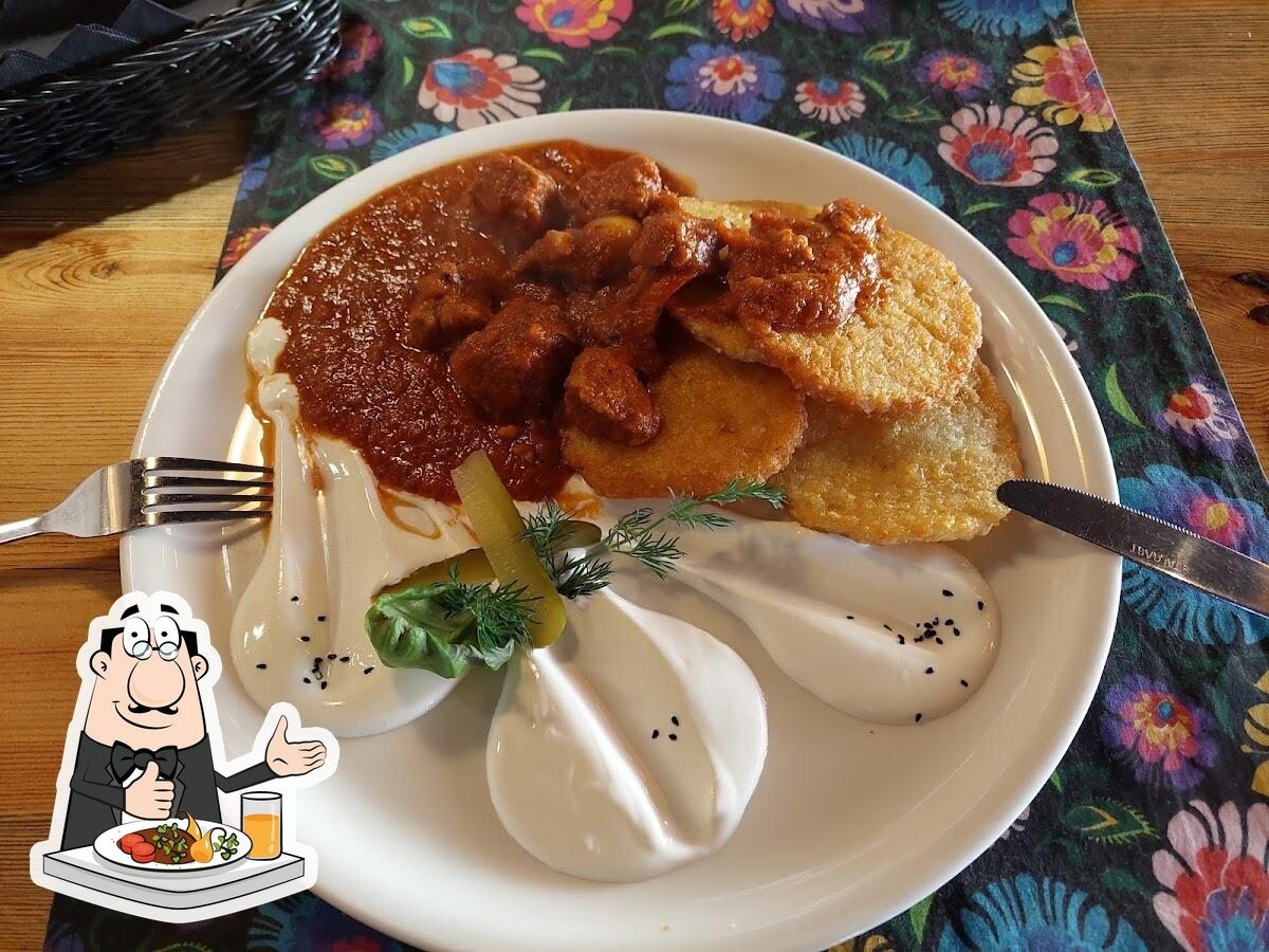 Spokojna restauracja o przytulnym wystroju serwująca owoce morza, dania z grilla, pierogi i pizze.
