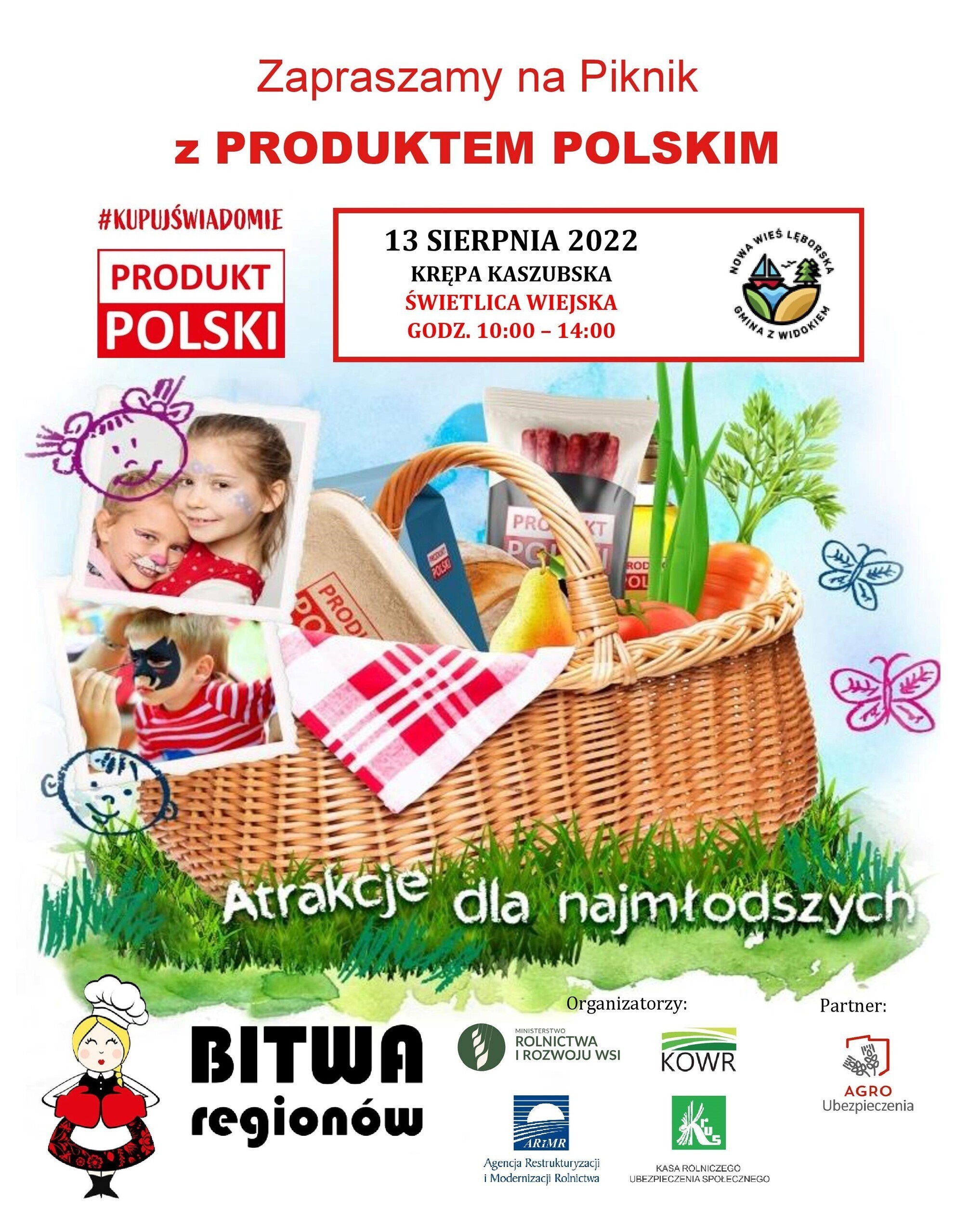 W sobotę 13 sierpnia, w Krępie Kaszubskiej, w godz. 10:00-14:00 odbędzie się Pikniki z PRODUKTEM POLSKIM, którego organizatorem jest Ministerstwo Rolnictwa i Rozwoju Wsi wraz z Krajowym Ośrodkiem Wsparcia Rolnictwa przy wsparciu Agencji Restrukturyzacji i Modernizacji Rolnictwa, Kasy Rolniczego Ubezpieczenia Społecznego oraz Powiatowych Zespołów Doradztwa Rolniczego.