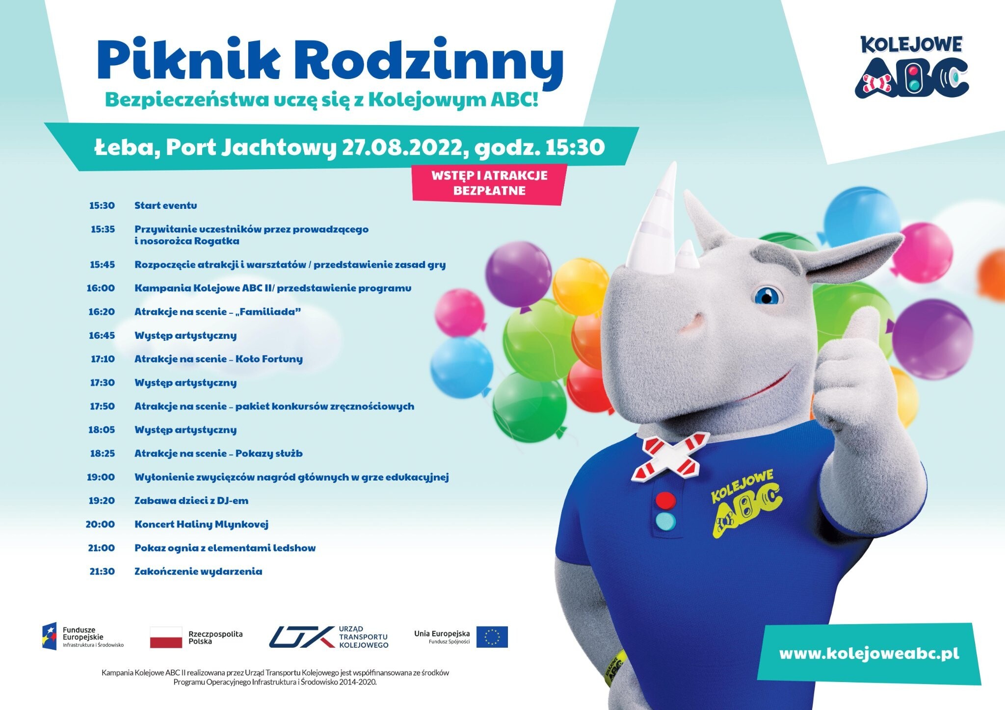 W ostatnią sobotę sierpnia teren Portu Jachtowego w Łebie przejmie nosorożec Rogatek, sympatyczny bohater Kampanii Kolejowe ABC II Urzędu Transportu Kolejowego. Na uczestników czekają wyjątkowe atrakcje, w tym niezapomniany pokaz fire show, zabawa na dmuchańcach, skoki na eurobungee, warsztaty kreatywne, spotkanie z Moniką Pyrek czy koncert Haliny Mlynkowej. Wstęp na piknik jest bezpłatny.