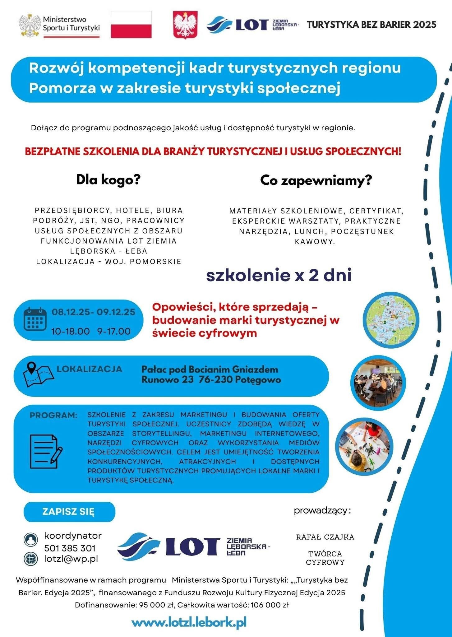 W dniach 8–9 grudnia 2025 r. odbyło się kolejne bezpłatne szkolenie dla branży turystycznej i usług społecznych, realizowane przez Lokalną Organizację Turystyczną Ziemia Lęborska – Łeba w ramach programu Ministerstwa Sportu i Turystyki „Turystyka bez Barier 2025”.